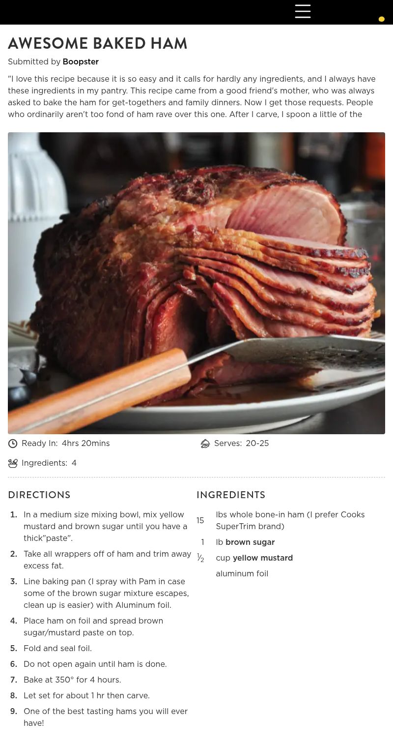 OMG!!! Until I tried this recipe, I wasn't wild about baked ham. Besides pizza, it would probably be one of the last things I'd really ever have a craving for. However, hams were on sale, and I remember my mom used to bake a ham, then use the remaining bone to put in a pot of red beans, which being from Louisiana, red beans and rice is a traditional weekly meal, and one of my favorites. I had a 9 lb. half ham, so I adjusted the recipe accordingly. The only addition I made was to put some ground cloves into the brown sugar/mustard paste, then right before it was done, I opened the foil, decorated it with pineapple and cherries, and returned it to the oven, uncovered, and under the broiler for about 5 minutes more, to try to caramelize it a little. Boopster, I will NEVER bake a ham any other way from now on! Because of your recipe, I love baked ham!! It was so moist and juicy, and just deeeeeeeeeelicious! Thank you very much for sharing! :)